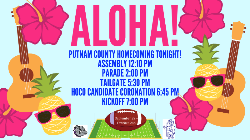 - Homecoming candidates announced at 6:45 pm and HOCO King and Queen crowned.